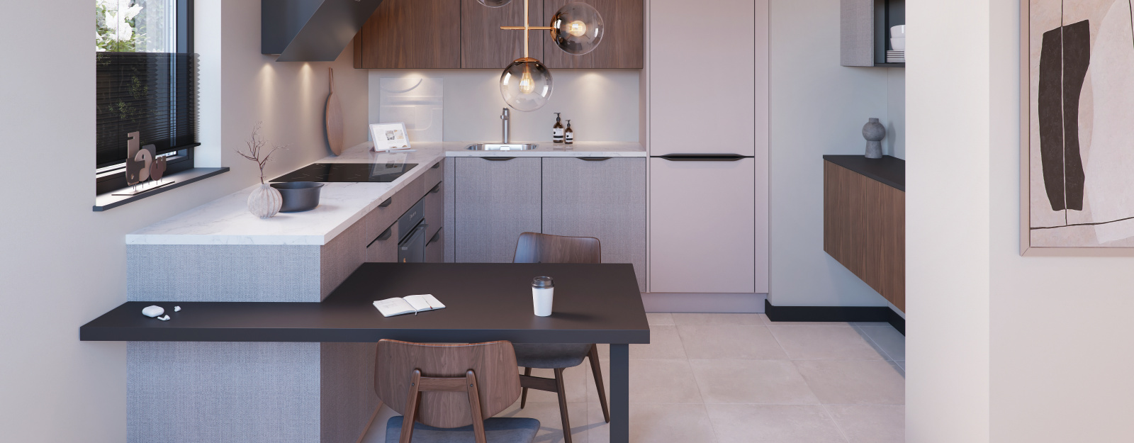 Een composiet werkblad in de kleur Calacatta Oro in combinatie met de tafel bestaande uit het kunststof blad Pure Brown.