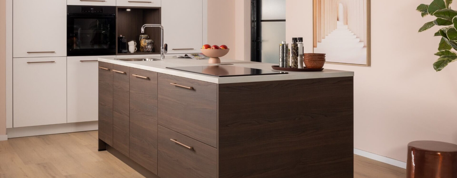 Wat meteen opvalt in de kastenwand is de ruime oven van 60 cm, waardoor je binnen een handomdraai grote hoeveelheden van je favoriete gerecht op tafel zet. Naast de oven zit een verlichte koffienis, die net als het kookeiland uitgevoerd is in Jura truffel eiken. Op de kalkwitte deuren zit de nieuwste greep Mendoza brons. Het eiland is voorzien van dezelfde grepen met structuur, zodat de keuken één modern geheel is.